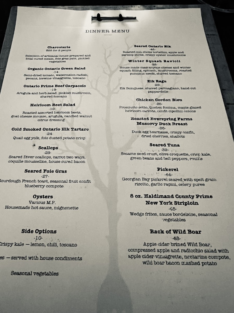 Guests will find a variety of carefully prepared options that showcase Ontario’s rich culinary landscape. Highlights like seared Ontario elk, wild boar rack, and braised bison short rib provide satisfying and robust main courses, while lighter choices such as heirloom beet salad, scallops, and oysters offer a fresh contrast. Charcuterie boards and creative small plates invite sharing, enhancing the relaxed yet polished vibe of the restaurant.